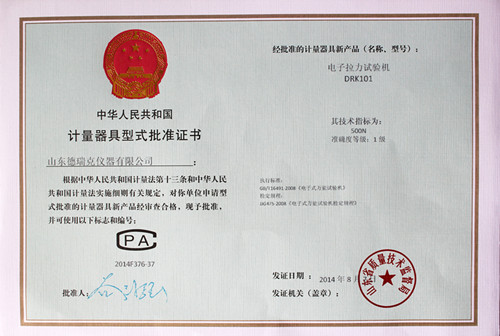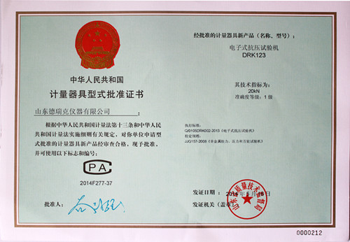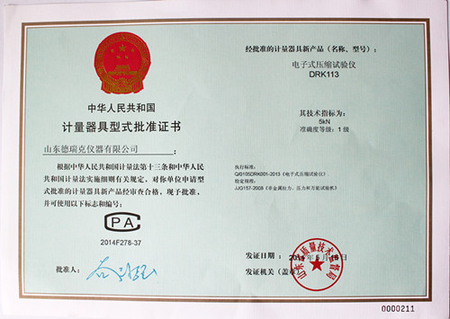 参加审核的型式批准的样机必须具备以下资料:(1)样机外形照片;(2)产品标准(含检验方法);(3)总装图、电路图和主要零部件图;(4)使用说明书;(5)制造单位或技术机构所做的试验报告等,德瑞克电子拉力试验机、电子式抗压试验机、电子式压缩试验仪等均满足上述条件,并通过现场严格的零点误差,线性误差、力值误差、颠簸实验等严格考核实验,各项技术指标均达到国家1级试验机的标准。